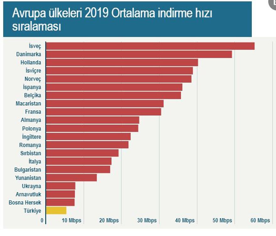Türkiye internet hızında da geriye doğru gidiyor. Ülkelerin internet genişbant hızı üzerine yapılan bir araştırmaya göre Türkiye, 207 ülke arasında internet hızı en yüksek 102. ülke oldu. Türkiye bu listede 2018 yılında 91 ve 2017’de 83. sıradaydı. Dünyada Tayvan birinci sırada yer alırken Avrupa’da en hızlı internet İsveç’te bulunuyor.