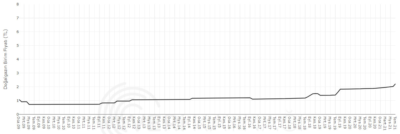 Doğalgazda yaşanan artış diğer ihtiyaçlarımıza kıyasla en masumu. Ancak Ocak 2009 – Mayıs 2009 arasındaki ucuzlama dönemi 12 yıl içinde bir daha asla yaşanmamış görünüyor. Keşfedilen yeni kaynaklar ve yapılan doğalgaz boru hattı anlaşmalarına rağmen birim fiyattaki yükseliş devam ediyor.