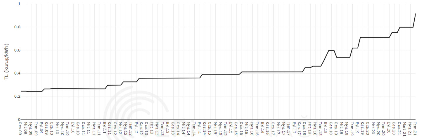Elektrik faturalarındaki artışın özellikle Ocak 2018’den hız kazandığını görüyoruz. Son 12 yıldaki artış 3,7 kat olurken, 2018’den bu yana artış 2,2 kat. Ayrıca Haziran 2021’den Temmuz 2021’e yaşanan artış 12 kuruş, yani 2009’daki birim fiyatın yarısı kadar.
