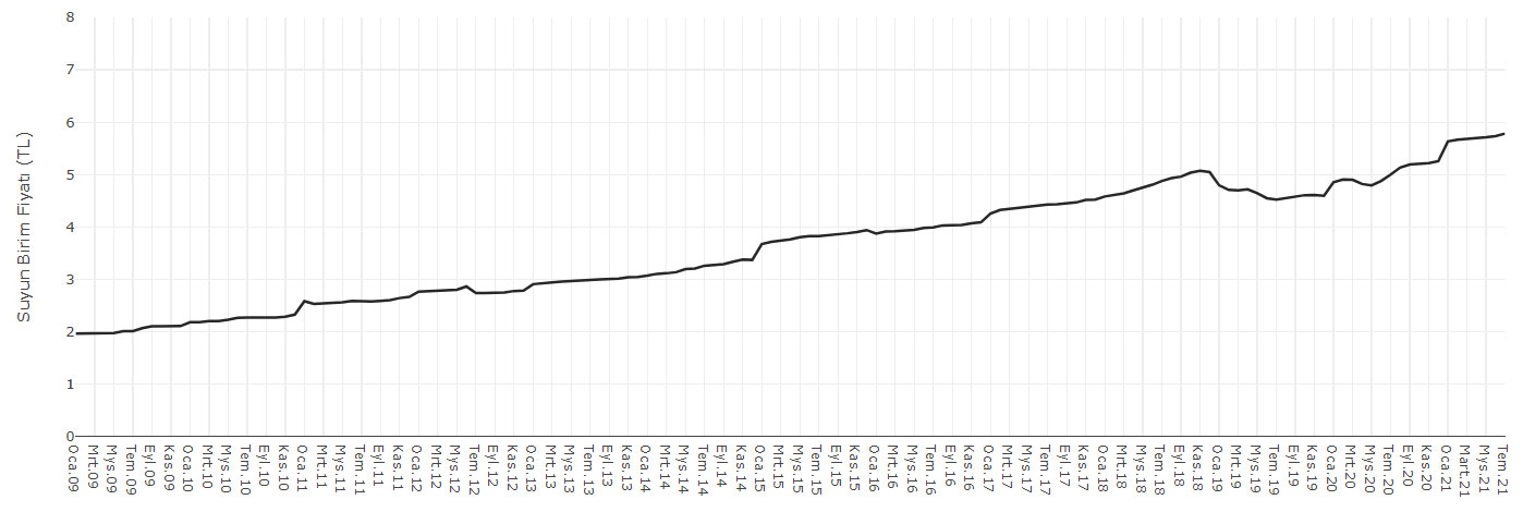 Su faturasındaki birim fiyat artışı elektrik kadar olmasa da 12 yılda yaklaşık 3 kata denk düşüyor. Kasım 2018 – Aralık 2020 arasında bir düşüş seyri yaşansa da 2021’in başından itibaren yine bir artış dönemine girdiğimizi görüyoruz.