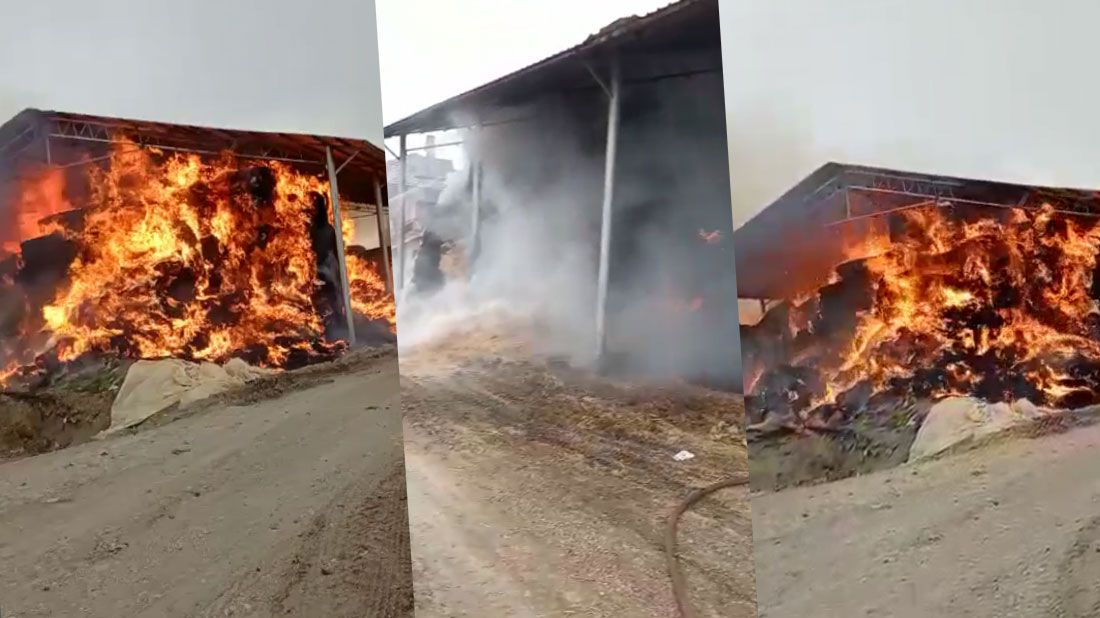 İçinde yaklaşık 50 ton saman bulunan alanda kısa sürede büyüyen yangın dev alevlere ulaştı.