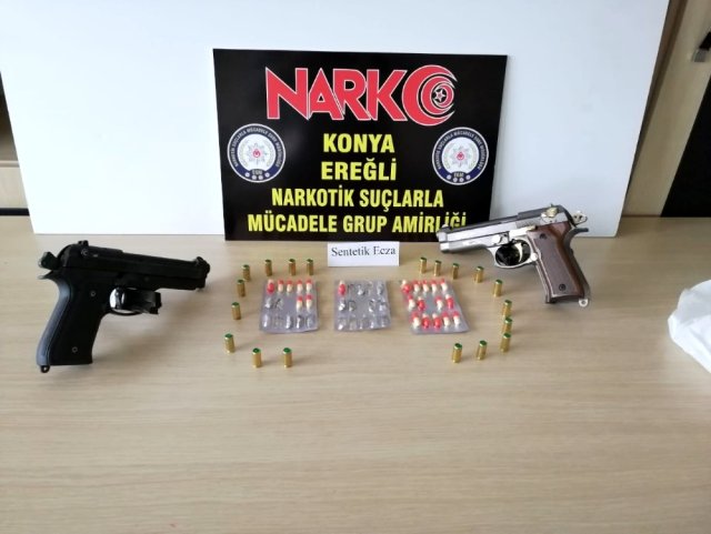 Ereğli’de Narkotik Suçlarla Mücadele Grup Amirliği ekipleri, Hacımütahir Mahallesi İnönü Caddesi üzerinde devriye attıkları sırada 2 şahsı şüphe üzerine durdu. E.U. (20) ve Y.K. (19) isimli şahısların üzerlerinde yapılan aramalar sonrasında toplam 22 adet uyuşturucu hap maddesi ele geçirildi. Şahısların evlerinde yapılan aramalarda ise, 2 adet tabanca bulundu. Gözaltına alınan 2 şahıs, ifadeleri alınmak üzere emniyete götürüldü.