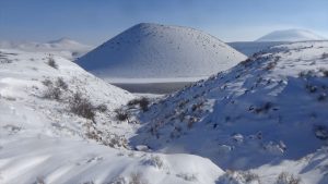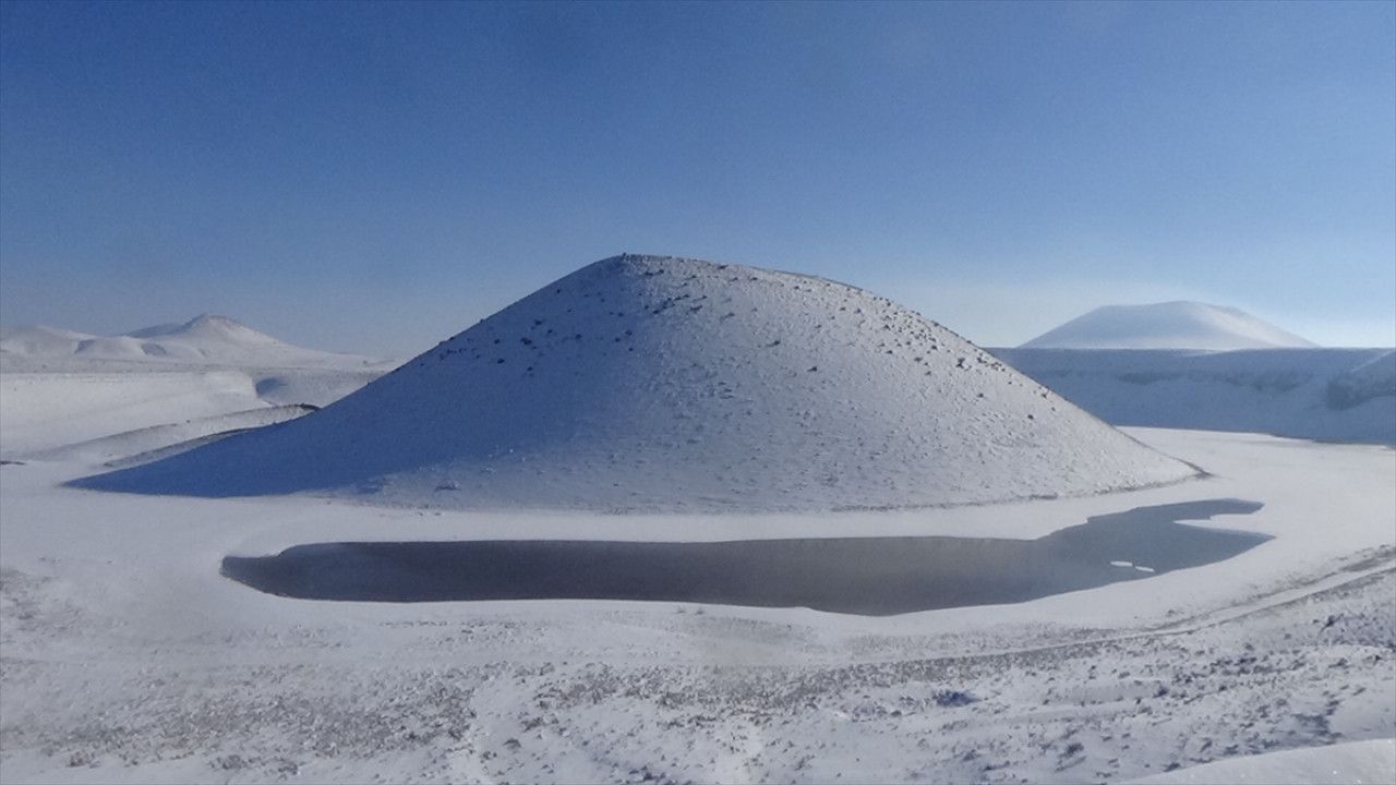 Konya’nın Karapınar ilçesindeki Meke Krater Gölü, bölgedeki yoğun kar yağışının ardından kartpostallık manzaralar oluşturdu.