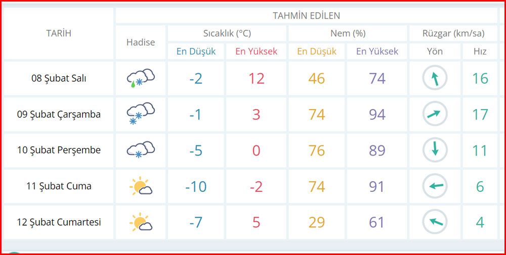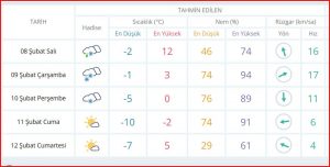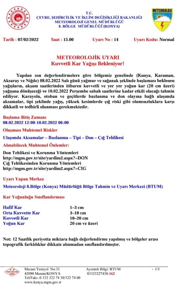 Meteorolojiden yapılan açıklamada; “İç Anadolu Bölgesinde beklenen yağışların 08.02.2022 Salı günü yağmur ve sağanak şeklinde başlayacağı akşam saatlerinden itibaren güney ve doğusunda, Konya, Karaman, Aksaray ve Niğde ve Nevşehir, Kayseri, Yozgat ve Sivas’ta kuvvetli ve yoğun kar (20 cm üzeri) yağışı şekline dönüşeceği, 10.02.2022 Perşembe sabah saatlerine kadar etkili olacağı tahmin ediliyor.