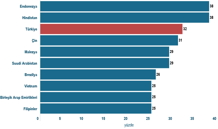 İlk 10’da yer alan diğer ülkelerse sırasıyla Suudi Arabistan (yüzde 29), Brezilya (26), Vietnam (yüzde 25), Birleşik Arap Emirlikleri (yüzde 25) ve Filipinler (yüzde 25).
